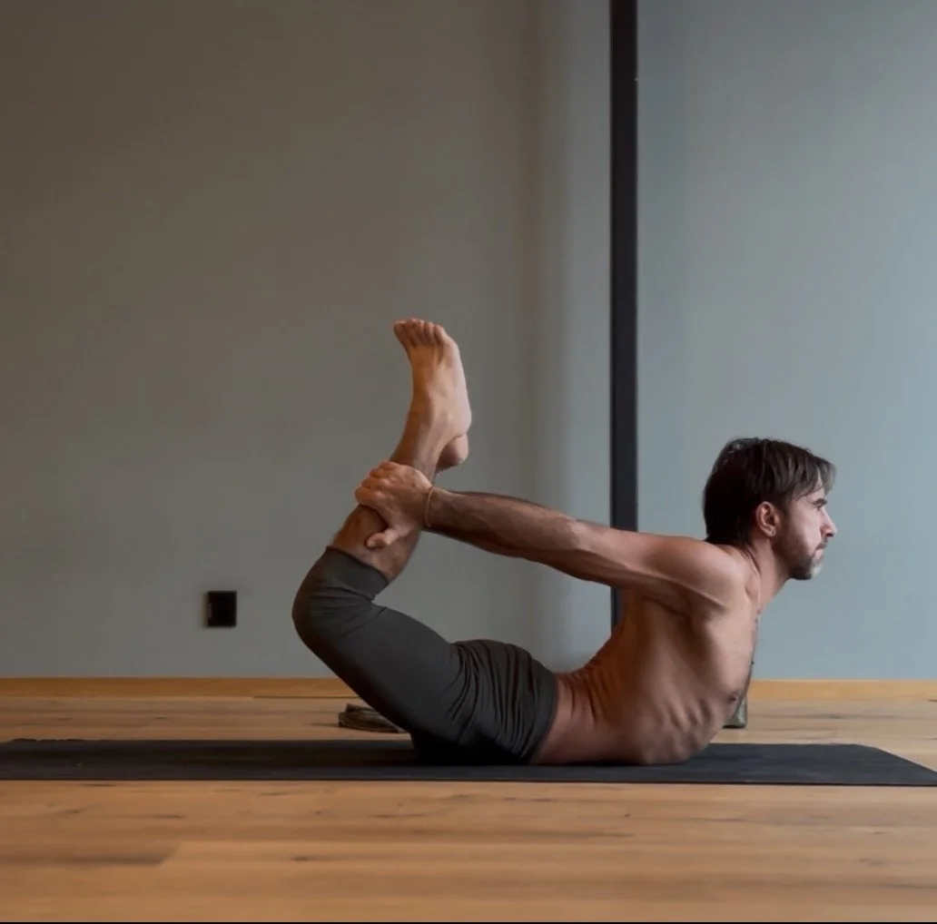 A good place to practice this is Dhanurasana. Often students will keep thier legs wide as this alleviates pressure in the low back, but to fully access the iliopsoas you will want to engage the adductors as shown above and bring the feet closer together. This action along with the instructions above on the pelvis will again allow you to access the iliopsoas.