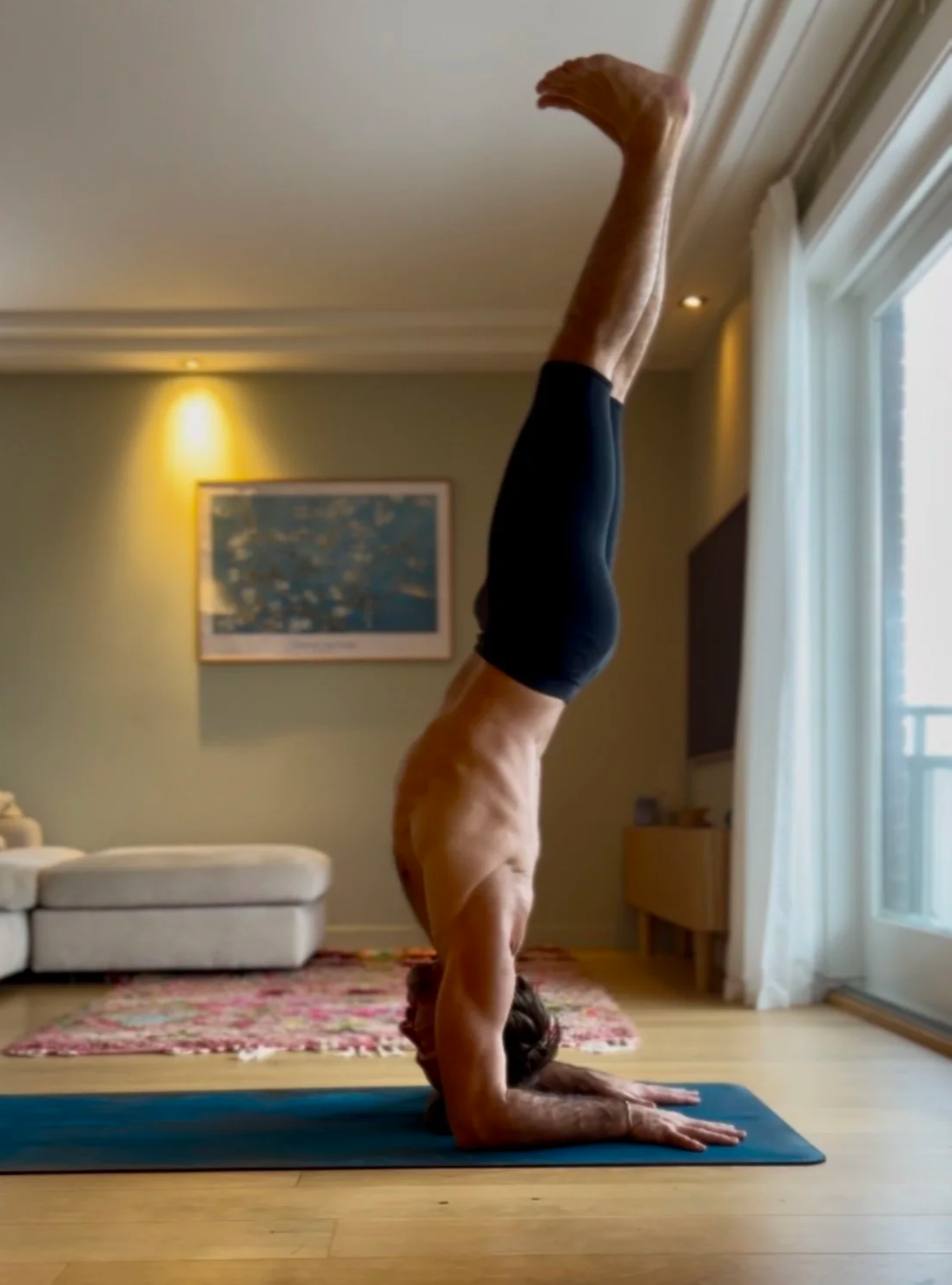 Initially you can kick up with the wall behind you for stability to practice. Once you can hold for 5 to 10 breaths here you can try without the wall.